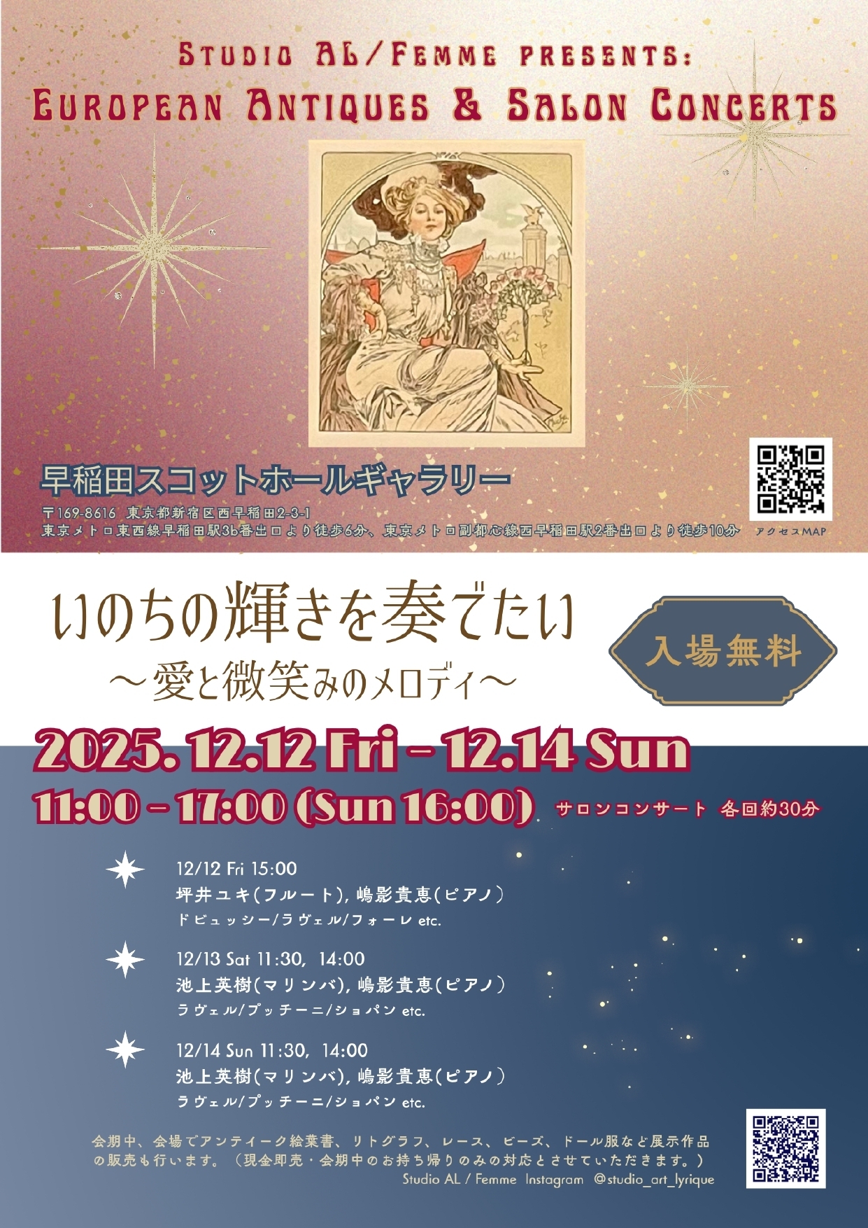 開催中/開催予定の展示 studio AL(株式会社ファム) 2025年12月12日(金)~ 12月14日(日) 渡辺禎雄型染版画展Vol.9 2025年12月18日(木)~ 12月23日(火) 神聖幾何学曼荼羅ペン画「光曼荼羅あそびver.3」 2026年4月30日(木)~ 5月4日(月) 六四紀念館収蔵写真展(タイトル未定) 2026年5月27日(火)~ 6月7日(日) 第48回キリスト教美術展 2026年6月19日(金)~ 6月29日(月) HOME 展示スケジュール 開催中/開催予定の展示 過去の展示 過去の展示DM 展示スペースのご案内 スペース仕様 作品展示イメージ ご利用にあたって 利用規約 アクセス・お問合せ 収蔵作品の貸出