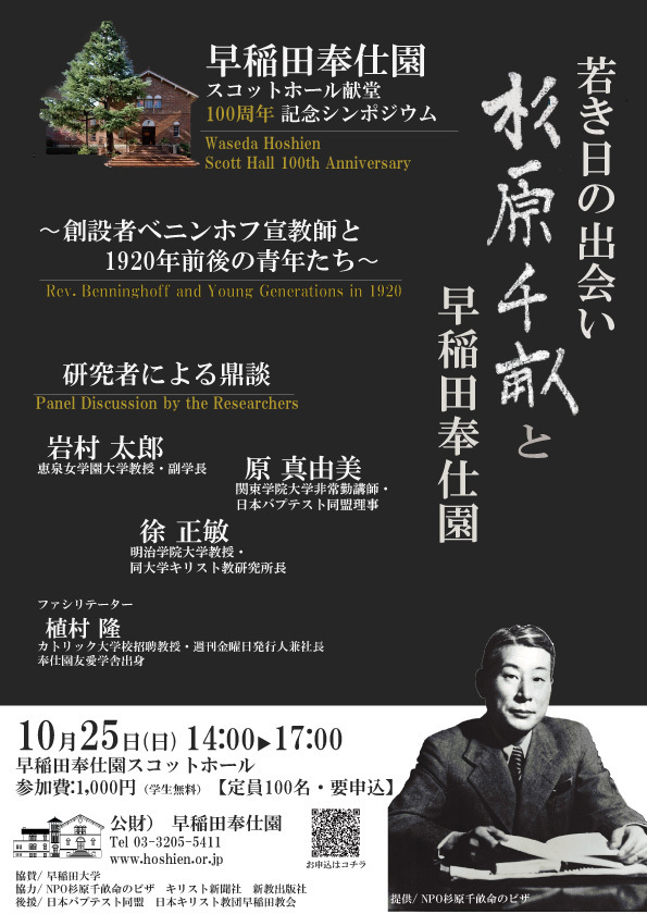 早稲田奉仕園スコットホール献堂100周年記念として、「若き日の出会い 杉原千畝と早稲田奉仕園」と題してシンポジウムを開催します。奉仕園でキリスト教に出会い「信交協会憲法」に署名をした外交官杉原千畝、1919年の「2.8独立宣言」起草メンバーやスコットホールでの訪日留学生たちの活動と奉仕園の係わりを検証するシンポジウムです。