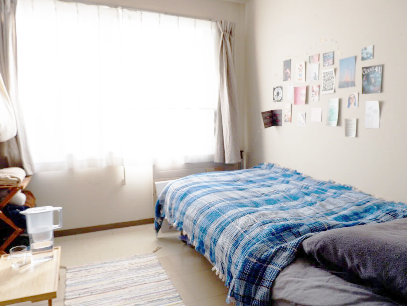 【居室】部屋は約6畳の1人用洋室。エアコン、机、スタンド、イス、たんす、ベッド、本棚、冷蔵庫が備え付けです。もちろんインターネット回線も完備です。