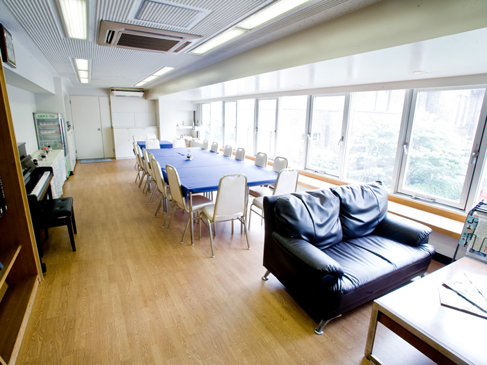 【ラウンジ】友愛学舎のある奉仕園会館2階ロビーは留学生の寮生にも開かれた明るいスペース。友愛学舎の朝の会と朝食もここが会場です。