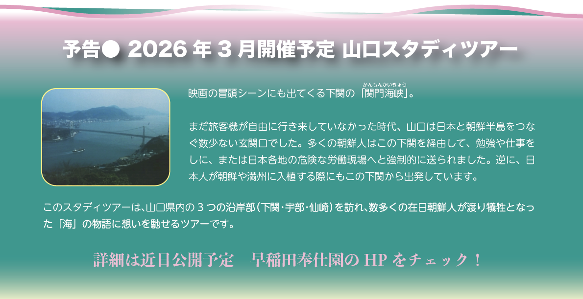1997年に公開されたこの映画は、解放から50年に及ぶ「在日」の歴史を映像化したもの。在日をめぐるさまざまな出来事を、膨大な映像資料、証言をもとに年代順に追っていきます。前半「歴史編」と後半「人物編」合わせて4時間半となる大作ですが、今回の上映会では「歴史編」(2時間15分)のみを上映します。